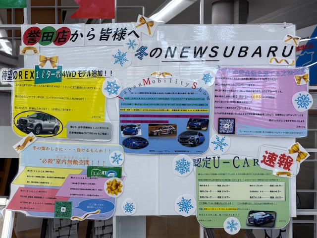 また店頭では、スバル保険やJAF、これからの季節に備えた整備等、掲示板にてご案内しております!
