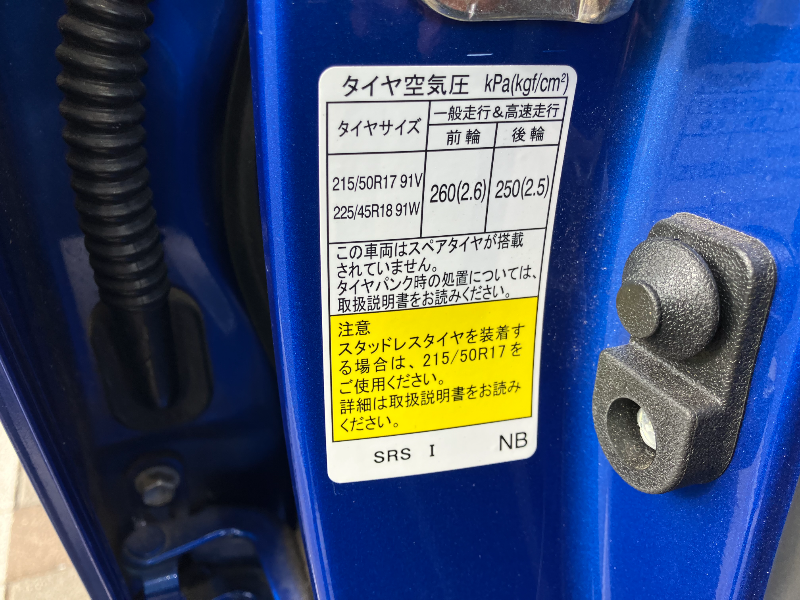スバル車の空気圧の標準は運転席ドアを開けたらシールが貼ってあります。
