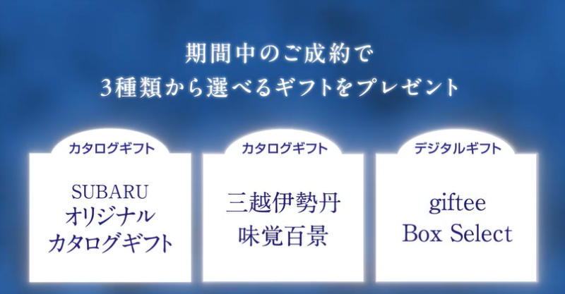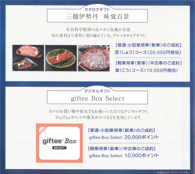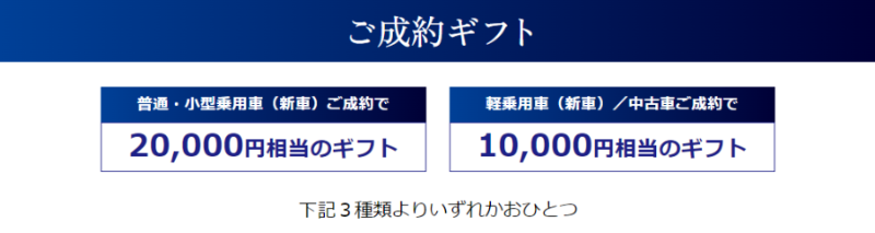 2月15日までに、お車をご成約頂いた方に、3種類より選べるギフトを特別なギフトをプレゼント。
