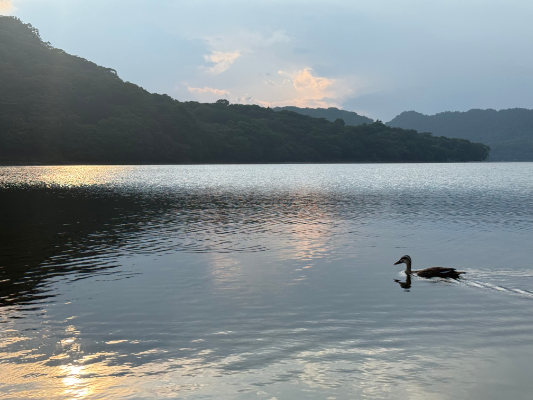 安定感抜群のクロストレックで快適に山道を潜り抜け、やってきた湖。